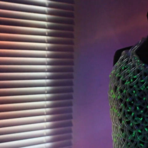 Este es un video de un vestido líquido. Tiene 600 pies de tubería tejida activada por una bomba situada en la mochila.