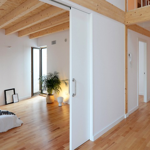 El sistema de preindustrialización, mediante forjados de vigas de madera contralaminada y envolventes mediante entramados ligeros de madera, permite un proceso constructivo rápido y eficiente. Y con su acabado interior de tableros de madera OSB en todos los forjados, se consiguen unos ambientes cálidos y confortables, potenciados por la utilización de un pavimento interior de madera natural.