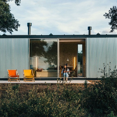 Tampoco quisieron renunciar al diseño y la calidad de los materiales, optando por una fachada de acero galvanizado y un interior con paredes y techos en madera OSB, suelo de roble, mobiliario de pino, chimenea interior para el otoño-invierno y cimentación adicional exterior en forma de terraza para disfrutar desde la primavera.