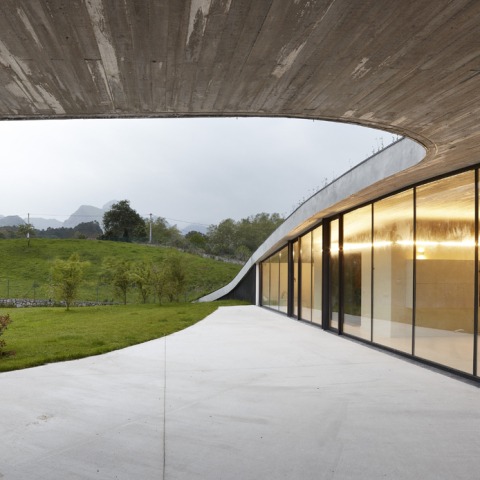 El proyecto aprovecha un resquicio en la normativa regional —que obliga a construir cubiertas a dos aguas de teja cerámica curva— para proponer un edificio que busca más integrarse en el bello paisaje natural de la zona que en el entorno construido que lo rodea. A fin de alcanzar una cota que permita optimizar las vistas hacia la montaña y el bosque que rodea la parcela, la intervención se lleva a cabo en la parte norte de la finca. Allí se desmonta la colina existente para reproducirla con una única cubierta ajardinada que cobija los diferentes usos, diluyendo así los límites entre lo natural y lo construido en un juego entre lo tectónico y lo estereotómico que remite a las intervenciones de land-art.