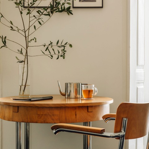 El blanco de la escayola que reviste todos los muros contrasta con el negro esmaltado y la cerámica rojiza de los suelos. Además, el mobiliario empleado, con diseños de principios del siglo pasado, potencia la relación entre pasado y presente, que conviven armónicamente en el interior de la vivienda.