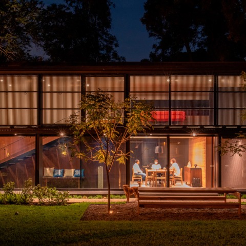 Dicho volumen funciona como una "choza de escopeta": una distribución alargada de espacios que permea desde lo público a lo privado. En un extremo, donde está la entrada principal, una gran sala de estar tiene chimenea, área de estar, piano y área de comedor. Una escalera está ubicada en un lado junto a la caja de madera que encierra la barra y el área de almacenamiento. Este mueble fijo bloquea intencionadamente las vistas hacia el jardín y obliga al usuario a contemplar el campo de golf. Junto al comedor, un volumen de tierra apisonada, que contiene la despensa, el lavadero y el baño de visitas, separa la gran sala de estar de la cocina y el salón, que opera frente a la sala de estar. Está encerrado por un mueble fijo similar que alberga parte de la cocina, una librería con el televisor y una pequeña estufa. Bloquea la vista desde el campo de golf y se dirige hacia el jardín y la piscina. Junto a la sala familiar, un estudio de arte de doble altura está ubicado al final del volumen y tiene su propio patio de trabajo en un extremo y en el otro el pasillo que conecta con el ala de los dormitorios de la casa.
