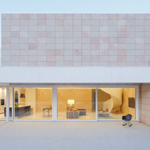El acceso peatonal se produce por la fachada norte a través del vestíbulo, donde una escultórica escalera de caracol filtra la visión del espacio central, zona de día y corazón de la vivienda. Una amplia estancia, definida como un vacío entre los módulos de habitaciones y servicios, donde salón-comedor y cocina se entremezclan en total relación con el jardín. Sin embargo, se ha optado por diferenciar ambos usos, dotando al primero de una doble altura que tiene su traducción al exterior en un potente volumen de piedra natural. La cocina, con acceso directo desde el aparcamiento exterior mantiene la altura estándar como continuidad del porche exterior.