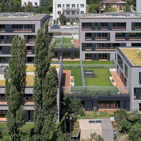 Dos edificios de apartamentos inferiores tienen tres y dos plantas sobre el suelo, y con su menor volumen siguen el tamaño de las villas a lo largo de la parte inferior de la parcela. Entre la acera de la calle Neumannova y los edificios de apartamentos superiores, se ha diseñado un espacio habitable semiprivado con una zona de estar. En el techo de la base del garaje entre los edificios individuales hay un patio privado con jardines conectados a los apartamentos. Están separados por setos bajos, cestas de gaviones plantadas con carpes.