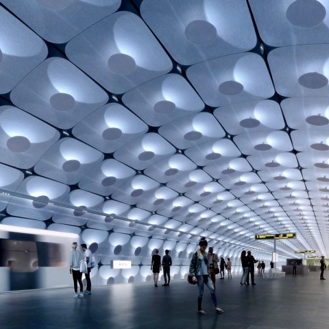Las entradas a cada extremo de la nueva estación Fornbuporten definen dos espacios cívicos distintos a nivel de la calle. Al sur, un pabellón ortogonal en capas y una plaza pública extienden las geometrías cartesianas de su tejido urbano circundante. Hacia el norte, un dosel ovalado se encuentra dentro del paisaje natural del parque comunitario en el que se encuentra. Estas geometrías contrastantes continúan bajo tierra para fusionarse a lo largo de las plataformas de la estación. Ambos pabellones de entrada reflejan el espectro completo de la luz dispersada que varía con el siempre cambiante cielo de Oslo. La iluminación atmosférica en toda la estación fluctúa en sintonía con la hora del día para mejorar el bienestar de los pasajeros.