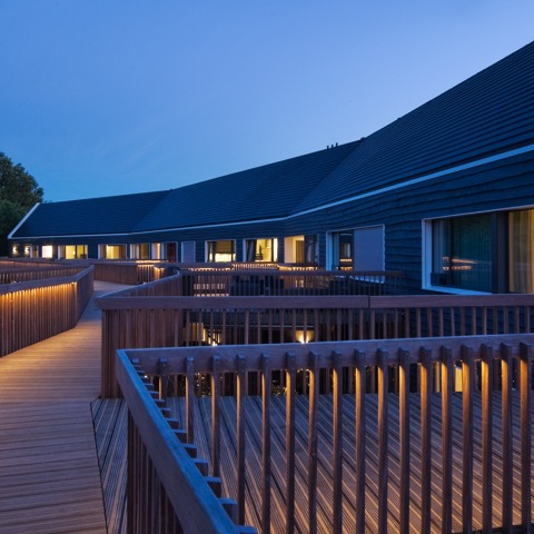 Este centro residencial de dos plantas y 110 metros de largo para personas con discapacidades mentales, ha sido diseñado con una estrecha conjunción con la estructura de árbol existente. La forma en zig-zag resultante, divide visualmente el edificio en áreas más pequeñas, áreas de escala humana, evitando así la percepción de una institución. Lentamente se levanta entre los árboles, una estructura de tablones de madera que accede a las viviendas en el primer piso, proporcionándole un paisaje secundario con una calidad única. Cada grupo de viviendas tiene su propia entrada, con bancos integrados que marcan la transición entre el exterior y el interior. De esta manera están invitando a los residentes a permanecer e interactuar con otros, al igual que las zonas de retiro en el interior, con suelos moos-clad y troncos de abedul.